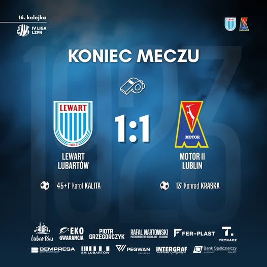 Po pełnym walki meczu 16. kolejki Macron IV ligi lubelskiej MKS Lewart Lubartów zremisował 1:1 na własnym stadionie z Motor II Lublin. Bramkę, która dała nam remis w dzisiejszym spotkaniu zdobył debiutujący oficjalnie w naszym zespole Karol Kalita.